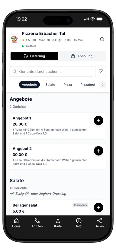 1 Pizza 45x32cm mit 4 Zutaten nach Wahl, 1 gemischter Salat und 1 Coca-Cola 1,0l